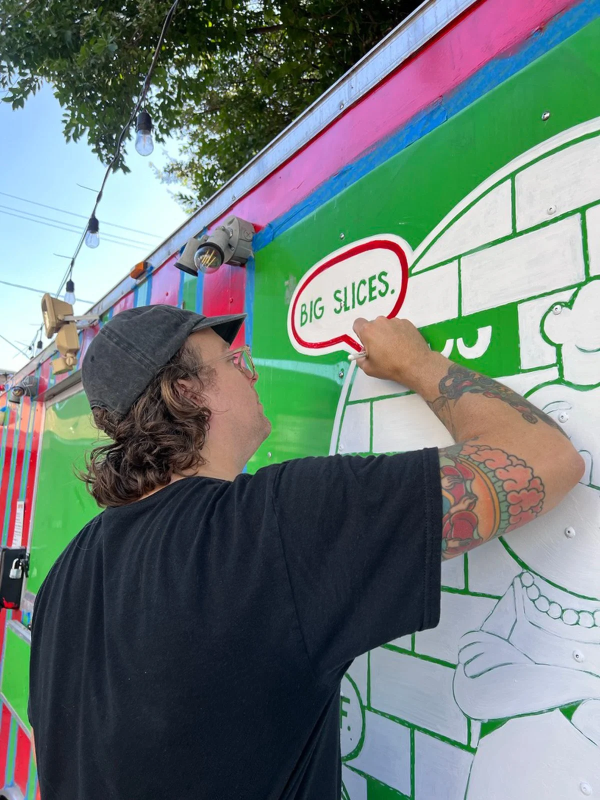 Designet ble tegnet digitalt, men målet var å gi det en midt-talls estetikk ved å male alt for hånd. Vi ønsket en klassisk pizzabutikk-følelse, lys og levende. Jeg malte traileren for hånd for å oppnå maksimal effekt.